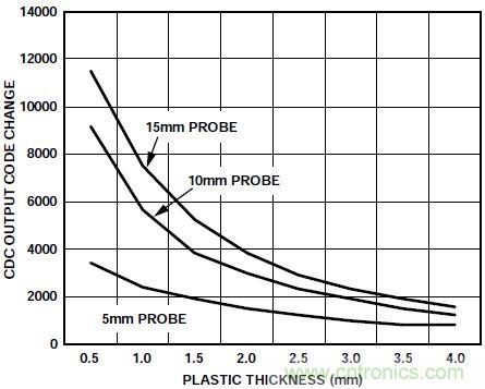 圖2所示為從CDC測量到的輸出數(shù)據(jù)。該數(shù)據(jù)表明,傳感器響應(yīng)隨塑料厚度的增加而減少。CDC輸出降至500個(gè)碼以下時(shí),按鈕傳感器的響應(yīng)會(huì)不夠。此時(shí)很難區(qū)分真正的傳感器激勵(lì)和CDC代碼中的噪聲。10 mm按鈕可配合上方大至4 mm的塑料使用。傳感器越小,響應(yīng)越小。對5 mm的按鈕而言,傳感器響應(yīng)可降至約500個(gè)碼。對5 mm按鈕而言,建議采用2 mm或以下的覆蓋塑料來確保傳感器正常工作。
