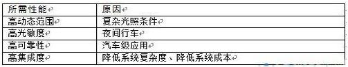 考慮到夜間行車,有些道路沒(méi)有路燈或者路燈很暗,汽車視覺(jué)系統(tǒng)也需要在低光照?qǐng)鼍跋虏杉窙r信息。針對(duì)汽車應(yīng)用,圖像傳感器需要滿足一系列汽車級(jí)要求,如寬溫度范圍、高可靠性、高集成度、低成本等。表1總結(jié)了汽車視覺(jué)系統(tǒng)中圖像傳感器應(yīng)該具有的性能: