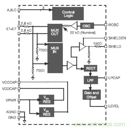 PCB還可能受到寄生電容的影響,這種電容最大可達(dá)20pF,它會在電容觸摸傳感器視為受到按壓時,使閾值發(fā)生偏移,從而改變其靈敏度。為了對寄生電容進(jìn)行補償,可以采用對DAC編程的方法,以抵消CDC的輸入。對于各PCB來說,這種寄生電容是一致的,因此可以在制造PCB的時候進(jìn)行簡單的調(diào)整,這樣就不需要外部RC調(diào)諧元件,從而使材料、裝配和測試相關(guān)的成本最低。單獨調(diào)整每個傳感器的偏移,使設(shè)計者可以充分利用轉(zhuǎn)換器的分辨率。