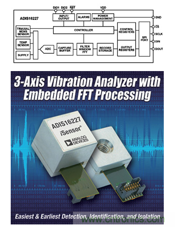 在一些應用案例中,相對簡單的傳感器輸出可能就足夠了,但在另一些應用中(例如,通過震動分析進行狀態監控),則需要增加相當多的處理過程才能實現所需的輸出。圍繞慣性傳感器而構建的一個高集成度器件示例是ADIS16227(見圖2),它是一款完全自治的頻域震動監控器。此類器件可能不提供相對簡單的g/mV輸出,而是提供特定應用分析。在本例中,其嵌入式頻域處理、512點實值FFT和片上存儲器能夠識別各震動源并進行歸類,監控其隨時間的變化情況,并根據可編程的閾值做出反應。