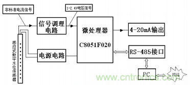 該系統的主要結構框圖如圖1所示,主要由感應式數字水位傳感器、信號調理電路、電源電路、MCU最小系統、4~20 mA輸出(AD421)、RS-485接口(MAX485),另外還包括PC,通過PC上位機監控軟件實現網絡通信功能。