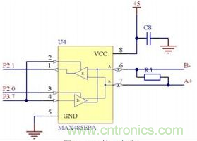 單片機C8051F020的P2.0、P2.1及P3.7通過MAX485與PC機相連,進行串行通信,如圖4所示。P3.7控制MAX485的狀態,接收或發送,用軟件控制。P2.1為單片機的串行輸入端,接收PC機通過MAX485向單片機發送的數據,P2.0為單片機的串行輸出端,通過MAX485發送給PC機。