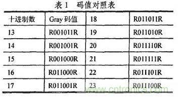 編碼采用格雷碼(Gray)為數值碼,以某一固定碼寬為參考碼R,它用于標尺定位和提高精度。Gray碼是一種絕對編碼方式的無權碼,它所具有的循環、單步特性能消除隨機取數時出現重大誤差的可能,其任意兩個柏鄰整數之間轉換時,只有一個位數發生變化,大大減少了由一個狀態轉到下一個狀態時的邏輯混淆,具有較強的容錯能力。以6位編碼為例,其部分十進制數與Gray碼的一一對應關系如表1所示。