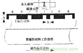 磁場通過磁性標尺形成通路,磁敏元件測出磁性標八表面變化引起的磁場變化。通過磁路分析和標罩磁位等高線計算發現,磁性標尺的槽深h越人越好,槽寬b應小于3mm。