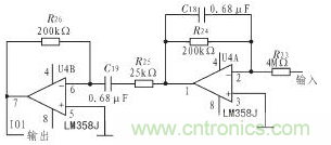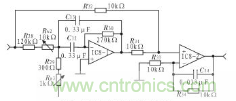 該低通濾波電路主要濾除干擾信號,并且要求幅頻特性中有最大的平坦區,為此選用四階壓控電壓源巴特沃斯But-terworth型濾波器。壓控電壓源型電 路結構的濾波器特點是使用元件少,對放大器要求不高。在本級電路中,電阻器誤差小于0.01%,電容器誤差小于O.1%。由于電路中所選電阻值不在電阻序 列之內,故實際電路中,用多個電阻串聯以求得到所需的阻值,電路中電容必須經過嚴格挑選。電路原理如圖5所示。10 Hz,0.6 Hz四階Butterworth LPF電路的元件值如表1所示。