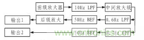 放大濾波電路是根據人體的呼吸率范圍(15~20次/min)和心率范圍(50~100次/min),經相關檢測電路的信號分為兩路,分別檢測呼吸和心跳 信號,具體結構框圖如圖4所示。其中放大電路主要包括前置放大電路、中間級放大電路和后級放大電路3部分。濾波電路主要有低通濾波、高通濾波和帶阻濾波。 其分別組成0.6 Hz的低通濾波器(CPF)、0.7 Hz的高通濾波器(HPE)及50 Hz的陷波器(BEF)。