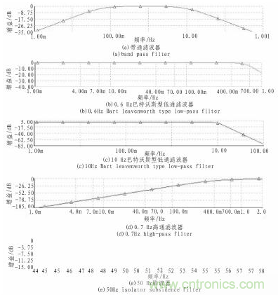 根據前面的設計電路,對0.05~1O Hz帶通濾波器、10 Hz和0.6 Hz的低通濾波器、0.7 Hz的高通濾波器及50 Hz的陷波器電路中各元件進行估值并通過MulTIsim仿真且反復調試,并通過電路試驗,獲得了較為理想的幅頻特性,各部分電路的幅頻特性測試結果如圖 8所示。從圖8中可以看出,0.05~1O Hz帶通濾波器、10 Hz和0.6 Hz低通濾波器、0.7 Hz的高通濾波器都具有平坦的3 dB通頻帶,50 Hz陷波器的Q值大于5。
