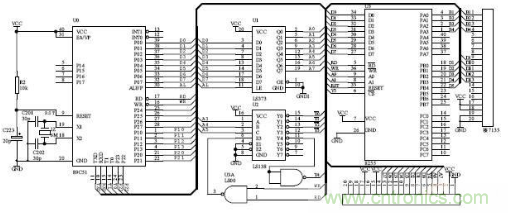 本設計使用的最小系統板是以80C52 單片機為內核,并且具有良好的擴展性。CPU 外接11.0592MHz 的晶振,主要由74LS373 鎖存電路、74LS138 譯碼電路以及按鍵、顯示器件、ICL7135 及其外圍典型電路組成,并用8255 外擴了I/O 接口。最小系統電路如圖2 所示。