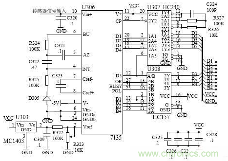本電路由一個小型集成電路來實現,采樣后的信號經過電位器送到ICL7135 進行處理,將處理后信號直接送到單片機最小系統。ICL7135 量程為0~2V,基準電壓由MC1403 輸出(2.5V)分壓獲得1V 電壓。