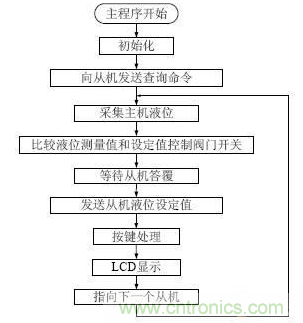 軟件部分主要是利用51 系列單片機作控制器,傳感器輸出電壓進行采樣,將采樣值與設定值比較,單片機對電磁閥控制來調節液位,主機通過485 通訊給分機設定數值,分機控制器對分機液位進行控制。軟件部分包括ICL7135 采樣部分、485 通訊部分、數字處理部分、顯示部分、鍵盤部分等。為了避免在傳感器移動造成測量數據不準確,特別增加了調零功能,進一步提高了系統的準確性。主程序流程圖如圖4 所示。