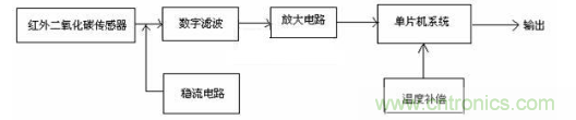 檢測電路由紅外二氧化碳傳感器、數(shù)字濾波電路、放大電路、穩(wěn)流電路、單片機系統(tǒng)、溫度補償?shù)冉M成。基本原理是紅外二氧化碳傳感器將檢測到的二氧化碳?xì)怏w濃度轉(zhuǎn)換成相應(yīng)的電信號,輸出的電信號分別經(jīng)過濾波、放大處理,輸入到單片機系統(tǒng),并經(jīng)溫度和氣壓補償?shù)忍幚砗螅蓡纹瑱C系統(tǒng)輸出送顯示裝置顯示其測量值。