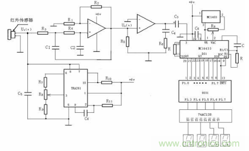 按照上述設(shè)計原理,設(shè)計的二氧化碳檢測電路如圖3所示。工作原理是首先由紅外傳感器將探測到二氧化碳?xì)怏w的濃度并轉(zhuǎn)換成電信號,濾波電路提取電信號并輸出到放大電路,經(jīng)過單片機系統(tǒng)處理后輸出,再由74AC138送入顯示電路,以實現(xiàn)對二氧化碳?xì)怏w濃度的檢測。