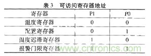 寄存器指針是向用戶提供所要訪問寄存器地址,寄存器指針的內容即為可訪問寄存器地址。由于DS75LX內部只含有4個可訪問寄存器,因此寄存器指針的內容只有低兩位(P1、P0)有效,當訪問某個寄存器時,必須確保寄存器指針已指向該寄存器。P1和P0的值與可訪問寄存器對應關系如表3所示。