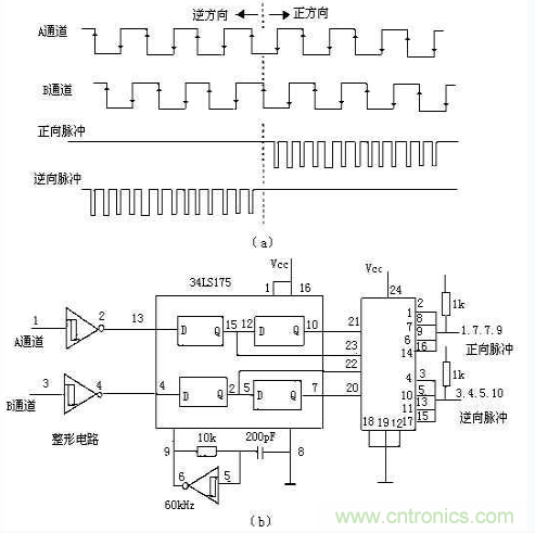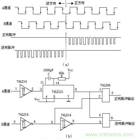 增量編碼器是以脈沖形式輸出的傳感器,碼盤比絕對編碼器碼盤要簡單得多且分辨率更高。一般只需要三條碼道,這里的碼道實際上已不具有絕對編碼器碼道的意義,而是產生計數脈沖。它的碼盤的外道和中間道有數目相同均勻分布的透光和不透光的扇形區(光柵),但是兩道扇區相互錯開半個區。當碼盤轉動時,它的輸出信號是相位差為90°的A相和B相脈沖信號以及只有一條透光狹縫的第三碼道所產生的脈沖信號(它作為碼盤的基準位置,給計數系統提供一個初始的零位信號)。從A,B兩個輸出信號的相位關系(超前或滯后)可判斷旋轉的方向。由圖3(a)可見,當碼盤正轉時,A道脈沖波形比B道超前π/2,而反轉時,A道脈沖比B道滯后π/2。圖3(b)是一實際電路,用A道整形波的下沿觸發單穩態產生的正脈沖與B道整形波相‘與’,當碼盤正轉時只有正向口脈沖輸出,反之,只有逆向口脈沖輸出。增量編碼器是根據輸出脈沖源和脈沖計數來確定碼盤的轉動方向和相對角位移量。通常,若編碼器有N個(碼道)輸出信號,其相位差為π/ N,可計數脈沖為2N倍光柵數,現在N=2。圖3電路的缺點是有時會產生誤記脈沖造成誤差,這種情況出現在當某一道信號處于‘高’或‘低’電平狀態,另一道信號正處于‘高’和 ‘低’之間的往返變化狀態,此時碼盤雖然未產生位移,但是會產生單方向的輸出脈沖。例如,碼盤發生抖動或手動對準位置時(下面可以看到,在重力儀測量時就會有這種情況)。