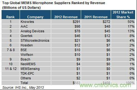 隨著市場的發展,MEMS麥克風市場的格局也在不斷的變化中。在HIS最新的分析報告顯示,樓氏電子繼續主宰MEMS麥克風市場,2012年以2.9億美元營收傲視所有其它供應商,樓氏一家營收已實際占到整個MEMS麥克風市場的一半。中國AAC和歌爾聲學排名第二和第四,ST異軍突起,擠進前五。