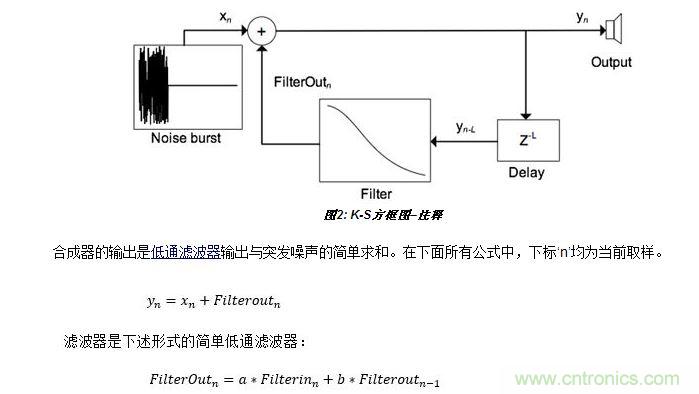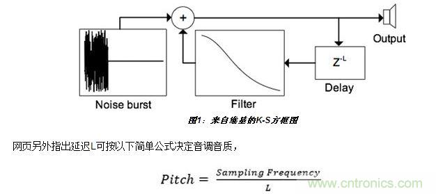 數字聲音合成技術總讓我這個業余愛好者感到著迷。一個有關Karplus-Strong吉他合成技術的維基網頁更加激發了我的興趣。它吸引我的地方是這種合成器設計非常簡單。下面是來自維基網頁的圖形(圖1):