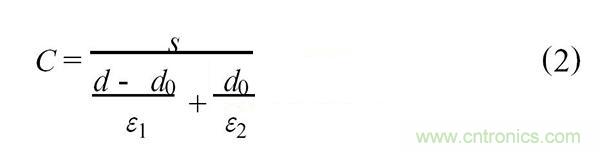 式中,S為極板相互遮蓋面積,單位為m2;d為兩平行板間的距離,單位為m;ε為極板間介質的介電常數;εr極板間介質的相對介電常數;ε0真空的介電常數。從上式可以看出,當d小時可使電容量增大,而使靈敏度增加,但d過小容易引起電容器擊穿,一般我們可以采取在極板間放置云母來改善,此時電容C為兩電容串聯,可寫成:
