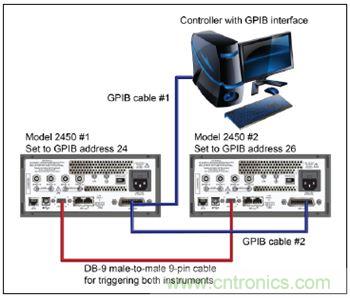為了支持兩部2450型源測(cè)量單元(SMU)儀器步進(jìn)掃描電壓之間的同步,將其外部觸發(fā)器彼此相連。所用電纜取決于用于控制測(cè)試的2450型儀器編程指令集。