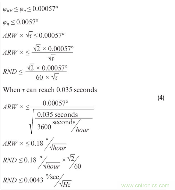 公式4將公式3的結果和公式2中的一般關系相結合,用來預測特定情況下對MEMS陀螺儀的ARW和RND要求。該過程假設圖像捕捉時間35 ms等于公式2中的積分時間 (τ),因而可以預 測,為了達到要求,陀螺儀的ARW需要小于0.18°/ hr,或者RND必須小于0.0043°/sec/ Hz。當然,這可能不是這些參數支持的唯一要求,但這些簡單的關系提供了一個例子,告訴我們如何將其與已知要求和條件聯系起來。