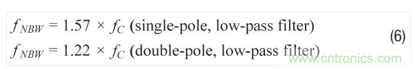 當RND的頻率響應遵循單極點或雙極點低通濾波器曲線時, 噪聲帶寬 (fNBW) 和濾波器截止頻率 (fC) 將有公式6的關系。