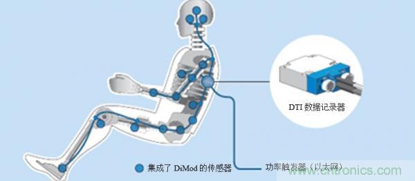 采集好的傳感器數據之后會被傳遞給假人體內的奇石樂DTI中央數據記錄器,再通過以太網繼續傳給COMBox/KiHUB數據接口設備。車內所有DTI系統通過該設備與中央網絡相連。這種解決方案的亮點在于:同步數據、觸發測試、供電僅需一根電纜。電纜始于假人,終于車載數據采集器。采集器一般通過隨行電纜等與主機相連。
