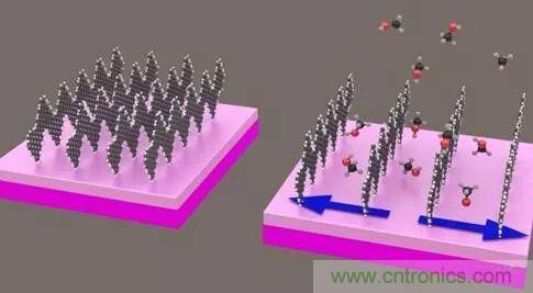 這張圖片呈現了氣體分子如何擴大團隊石墨烯納米帶行與行之間的間隙。內布拉斯加州材料與納米科學中心的AlexanderSinitskii及其同事已經提出這種現象部分地解釋了納米帶如何為傳感器提供前所未有的靈敏度Sinitskii和他的同事懷疑納米帶的顯著性能部分來源于納米帶和氣體分子之間非同尋常的相互作用。不同于他們的前輩,該團隊的納米帶排列整齊,類似于查理布朗的條紋襯衫般垂直放置,而不是平躺在表面。該團隊指出,氣體分子可以將這些行列分開,有效地延長了納米帶之間的間隙,幫助電子跳躍到導電區。加入(苯)環