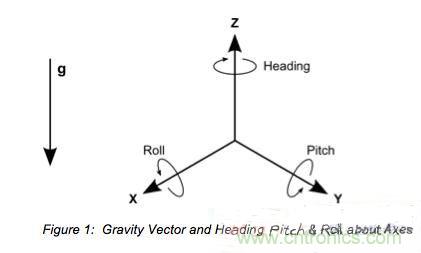 圖1:重力矢量和圍繞軸的航向、傾斜和滾動。
