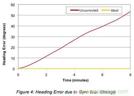 圖4:由于陀螺儀零偏變化引起的航向誤差。