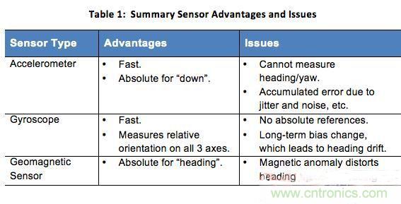 如前所述,加速度計、陀螺儀和地磁傳感器每個都有各自的優缺點。下表1總結了每種傳感器在運動跟蹤方面的主要優勢和問題。