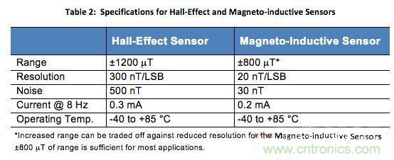 在今天的消費電子產品中使用最廣泛的地磁傳感器是霍爾效應傳感器。這種傳感器主導消費市場的原因是體積小、價格低并且節省功耗。但這種傳感器同樣有噪聲,很容易受其它磁場干擾,這些問題如果不校正將限制其向陀螺儀提供正確航向數據的能力。然而,如果能夠接受稍大尺寸的永磁感應式地磁傳感器,就可以在不犧牲成本或功耗的情況下獲得顯著改進的噪聲與分辨率性能。表2顯示了霍爾效應和永磁感應傳感器的規格。注意,永磁感應傳感器可以提供明顯更低的噪聲和更高的分辨率。
