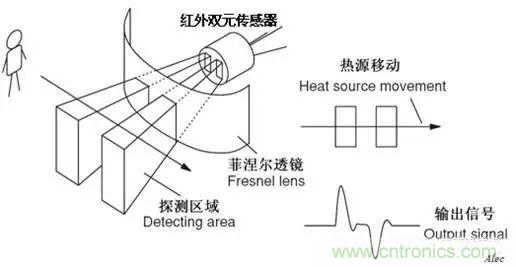 被動紅外傳感器包含兩個互相串聯(lián)或并聯(lián)的熱釋電元。而且制成的兩個電極化方向正好相反,環(huán)境背景輻射對兩個熱釋電元幾乎具有相同的作用,使其產(chǎn)生釋電效應(yīng)相互抵消,于是探測器無信號輸出。