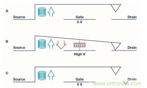 請注意,即便是在開啟位置上,開關梁仍然會有將開關往上拉動的彈簧力(藍色箭頭),但是只要向下拉動的靜電力量比較大,那么開關就會維持在開啟的狀態。 最后,當閘極電壓被移除時(圖一中的C狀況),也就是在閘極電極上0 V,靜電吸引力也會跟著消失,而開關梁會以具有足夠回復力(藍色箭頭)的彈簧而動作,開啟源極與汲極之間的鏈接,然后回返至原本的關閉位置。