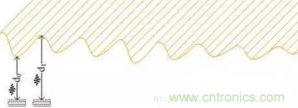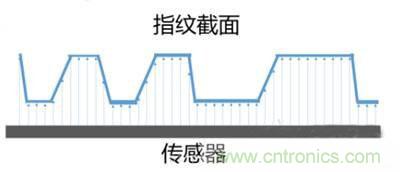 其原理是將電容感整合于一塊芯片中,當(dāng)指紋按壓芯片表面時(shí),內(nèi)部電容感測(cè)器會(huì)根據(jù)指紋波峰與波谷而產(chǎn)生的電荷差,從而形成指紋影像。如下簡(jiǎn)圖,可以把上面的凹凸認(rèn)為是指紋的谷和脊,那么同傳感器就會(huì)形成不同的電容差,這樣傳感器就可以根據(jù)這些不同的電容差畫(huà)出指紋的紋理。