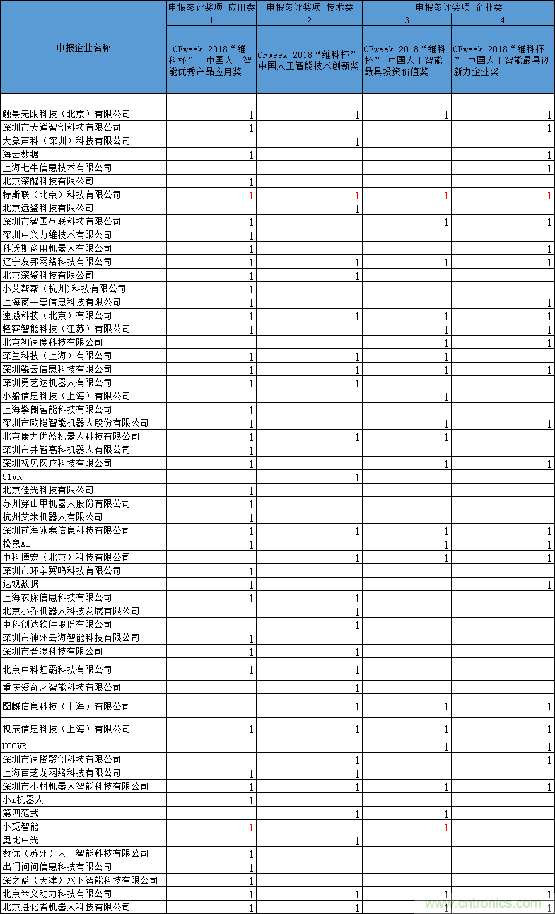 本次評(píng)選是2018年度唯一一項(xiàng)由權(quán)威行業(yè)門戶舉辦的重大賽事,全程免費(fèi),活動(dòng)費(fèi)用由評(píng)選組委會(huì)承擔(dān),企業(yè)無須支付任何參評(píng)或獎(jiǎng)項(xiàng)費(fèi)用;評(píng)委團(tuán)由各大投資機(jī)構(gòu)、協(xié)會(huì)、院校、孵化平臺(tái)以及著名投資人組成,嚴(yán)格把關(guān);獎(jiǎng)項(xiàng)覆蓋全人工智能產(chǎn)業(yè)鏈結(jié)構(gòu),設(shè)立4大獎(jiǎng)項(xiàng)讓所有人工智能企業(yè)都有機(jī)會(huì)競(jìng)逐獎(jiǎng)項(xiàng);并且參評(píng)企業(yè)還可以免費(fèi)參與同期OFweek舉辦的中國(guó)人工智能大會(huì),與資深專家和行業(yè)大咖面對(duì)面,學(xué)習(xí)最前沿、最熱門實(shí)用的市場(chǎng)趨勢(shì)及技術(shù)應(yīng)用。
