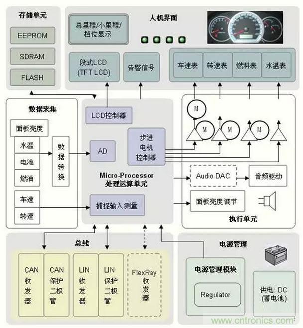 在汽車儀表系統中,各種儀表的傳感器的作用是將發動機溫度、機油壓力、發動機轉速、變速器輸出軸轉速、燃油箱油面的高低等物理參量轉換為相應的電壓、電流或電脈沖。并驅動相應的儀表動作,顯示相應的被測量參量。當測量值達到預設的極限值時就會使指示燈報警。