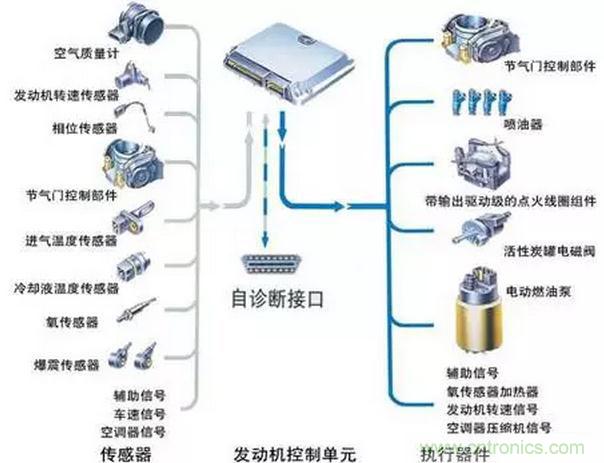 汽車電子控制系統有傳感器、電子控制器(ECU)和執行器的組成。在汽車電子控制系統中,傳感器的作用是將被控對象的相關參量轉換為相應的電信號,并輸送給控制器,控制器根據相關傳感器的信號對被控對象的工況及狀態進行分析與判斷后,輸出控制信號,通過執行器實現自動控制。電子控制系統分為發動機電子控制系統、底盤電子控制系統和車身電子控制系統。