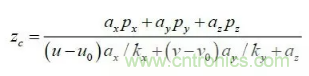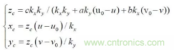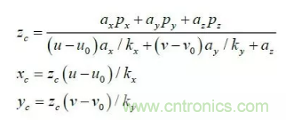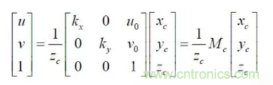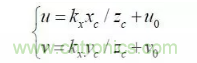 其中:(u,v)是特征點(diǎn)的圖像坐標(biāo),(u0,v0) 光軸中心的圖像坐標(biāo),(kx ky )是X 軸,Y 軸方向的放大系數(shù),(xc yc zc) 是特征點(diǎn)在攝像機(jī)坐標(biāo)系下坐標(biāo), Mc 是攝像機(jī)內(nèi)參數(shù)矩陣。