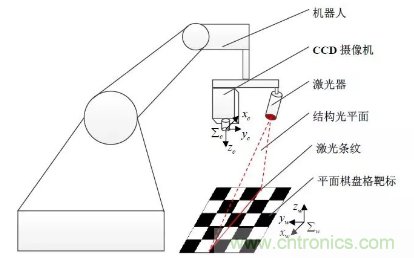 一個六自由度機(jī)器人,一個CCD 工業(yè)攝像機(jī),一個激光器和一個平面棋盤格靶標(biāo)。