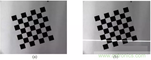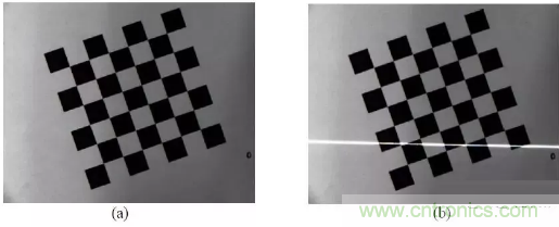 圖像的獲取是在攝機(jī)參數(shù)標(biāo)定過程中同時完成。 首先將棋盤格放在工作臺上, 在這個初始位置,利用攝像機(jī)采集一幅圖,如圖 (a) 所示 。保持?jǐn)z像機(jī)和棋盤格的位置姿態(tài)不變,打開激光器讓條紋投射到棋盤格上, 再采集一幅圖像如圖 (b) 所示: