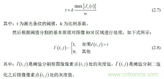 根據(jù)圖像中激光條紋的灰度值高于圖像中其它像素的灰度值以及激光條紋所在區(qū)域比較集中的特點(diǎn),利用圖像ROI 內(nèi)行像素灰度值之和計算激光條紋的自適應(yīng)閾值: