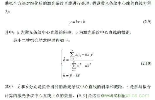 選取激光條紋中心線上的兩個點(diǎn)作為激光條紋的特征點(diǎn),為了提高激光條紋中心線的提取精度,利用最小二乘法擬合方法對細(xì)化后的激光條紋直線進(jìn)行處理。