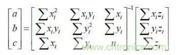 至此,得到四個激光條紋特征點(diǎn)的圖像坐標(biāo),由上式得四個激光條紋特征點(diǎn)在攝像機(jī)坐標(biāo)系下的坐標(biāo),由于三點(diǎn)確定一個平面方程,使用最小二乘法計算結(jié)構(gòu)光平面方程如下: