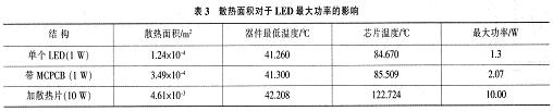 表3為3種不同散熱方式對(duì)LED的溫度分布、最大功率的影響。可以看出,增加散熱面積是很好的散熱方式,可以輕易地提高LED器件散熱能力,這是目前LED產(chǎn)品所普遍使用的散熱方式之一。然而缺點(diǎn)也很明顯:影響成本、增加產(chǎn)品重量、影響封裝密度。無(wú)限度地提高LED散熱片面積顯然不現(xiàn)實(shí),因此一般使用1.5inch2散熱片提升LED產(chǎn)品最大功率至10W左右,出于成本等因素就不能繼續(xù)提高。